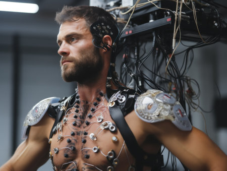 Cuttingedge futuristic brain interface experiment, a hightech neural connection technology with wires. Electrodes. And ai for closeup brainwave monitoring and healthcare diagnostics