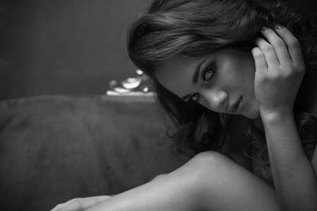 Portrait of a charming sexy woman in lingerie lying on the bed and looking at camera.