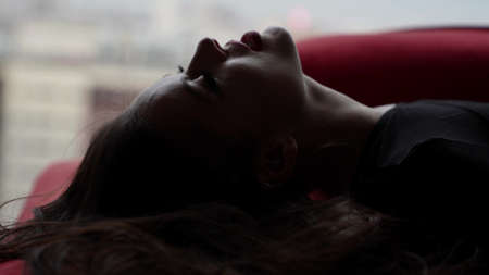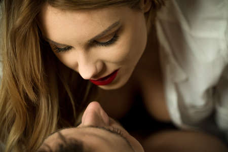 Close-up of young beautiful sexy woman lying on her man
