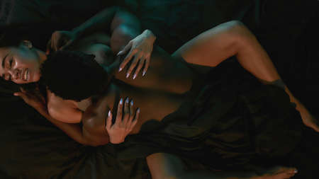Deep connection. Young sensual naked african couple of lovers hugging and holding hands while lying on the black sheet in bedroom