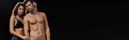 Panoramic shot of sexy girl embracing shirtless man isolated on black
