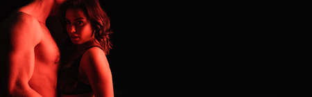 red lighting on sexy woman in lingerie near muscular man isolated on black, banner