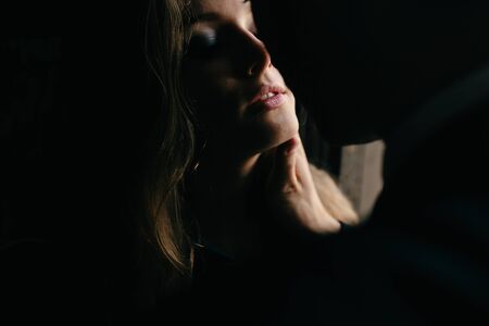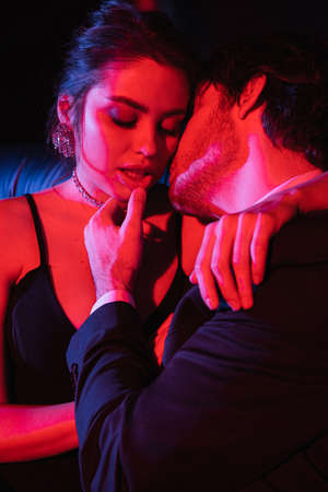 Close-up portrait of a passionate man and young woman kissing and making love in a dark room with dim red lighting. Love concept.