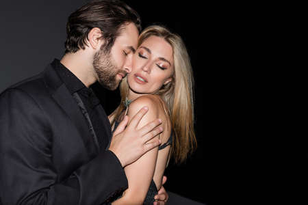 Bearded man touching sensual blonde girlfriend on dark background