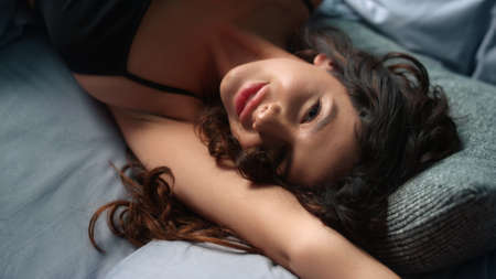 Top view attractive woman face smiling camera in bed. Portrait of seductive girl lying on pillows in bed. Closeup sexy model posing in lingerie at bedroom in slow motion