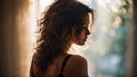 Ava sheer lingerie silhouette from behind slender woman with tousled hair soft bokeh lighting intimate