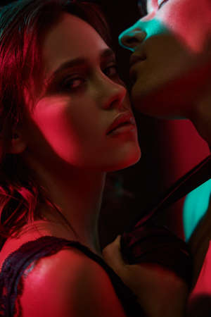 Close-up portrait of a passionate man and young woman hugging and making love in a dark room with dim red lighting. Love concept.