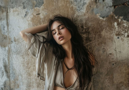 Elegant woman posing against rustic wall