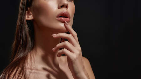 Cropped portrait of brunette woman with pouty lips posing isolated over black background
