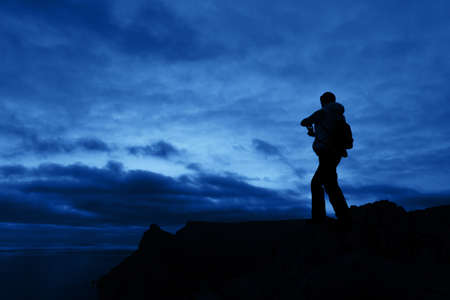 Silhouette of a young who like to travel and photographer, taking pictures of the beautiful moments during the sunset, sunrise.