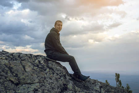 Man is sitting on a stone hillside, hands looking at the view from the heights and enjoys the freedom and achievement of goals
