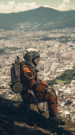 Astronaut on the top of a mountain with city view in the background