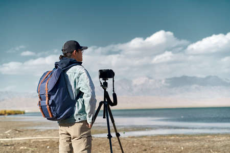 asian photographer standing by a lake looking at view observing