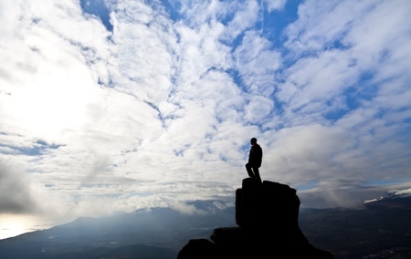 A peaceful silhouette of a man standing on a hilltop, surrounded by glowing sunrise clouds in warm hues.