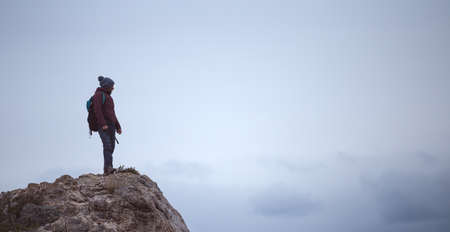Young girl hiker stands on big rock against the backdrop of mountains and watches the sunset
