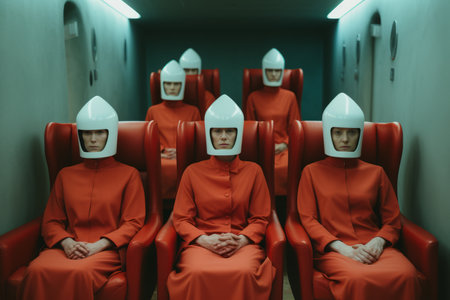 a group of women wearing white helmets sitting in red seats
