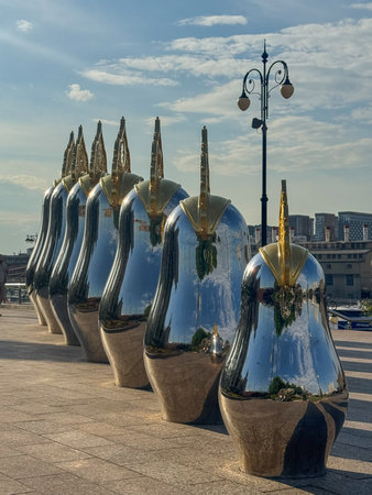 Reflective sculptures stand in a row under a blue sky in an urban area.