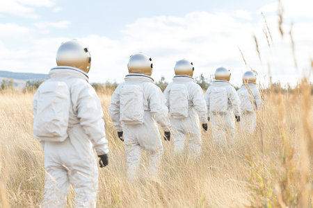 Groups of astronauts explore a golden grassland under a bright sky during the daytime showcasing a serene environment.