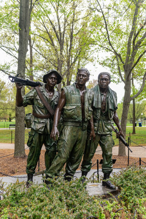 Powerful memorial sculpture honoring Vietnam War soldiers, standing among trees in Washington DC