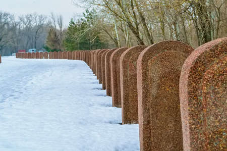 Straignt row of gravestones in winter