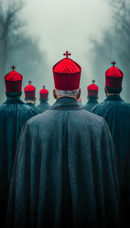 Several religious figures in deep robes and vibrant red head coverings gather outdoors, conveying solemnity and unity amidst nature.