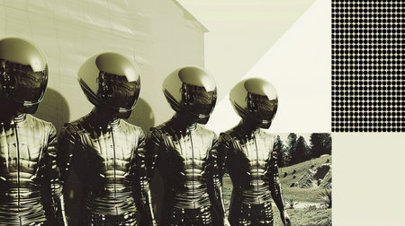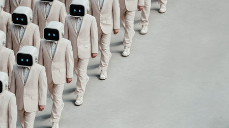 Futuristic robots in uniform suits marching in perfect sync on minimalist background.