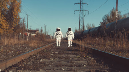 Two astronauts are walking on abandoned railroad tracks in a post apocalyptic, surreal setting, hinting at space exploration and the search for new worlds after earth