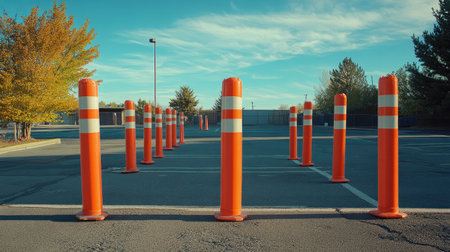A set of orange traffic poles and striped plastic tubes placed in a parking lot to mark restricted areas