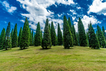 Pine trees on slope of green grass with blue cloud