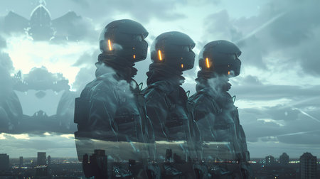 Clone Society, Dystopian Outfits, Identity Search, Urban Landscape Journey, Cloudy Weather, Digital Art, Backlights, Double Exposure, Low-angle view