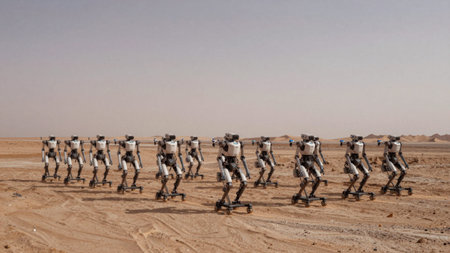 Of humanoid robots walking in a continuous line across a vast, barren landscape. The robots are predominantly white with metallic.. Suitable for corporate presentations, web banners, marketing layouts and UI design. Features: group, humanoid, robots, walking, continuous.