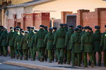 Legs of real soldiers in military boots and clothes standing in formation on the grass. Background with copyspace.