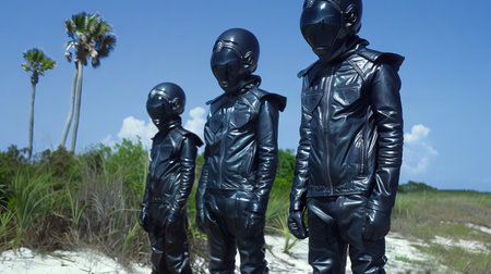 Futuristic figures in black leather suits with helmets standing on a tropical beach. Concept of science fiction, technology, and futuristic fashion.