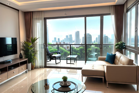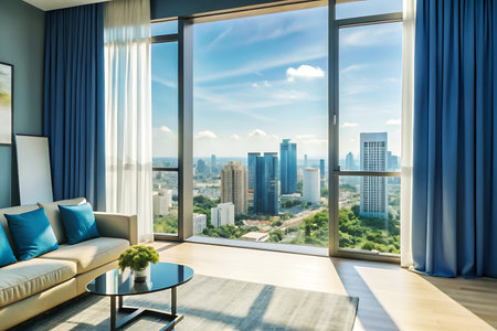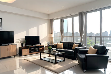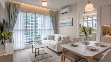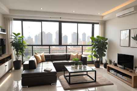 This modern living room showcases stylish furniture and a bright, airy atmosphere. Enjoy natural light streaming through large windows, highlighting urban views.