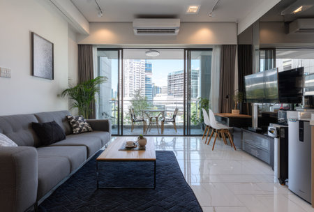 An interior shot showcases a modern living room featuring a grey sofa, coffee table, and large glass doors leading to a balcony. The room is brightly lit with natural light, highlighting the contemporary furniture and minimalist style. This image is suitable for architectural, lifestyle, and real estate marketing materials.