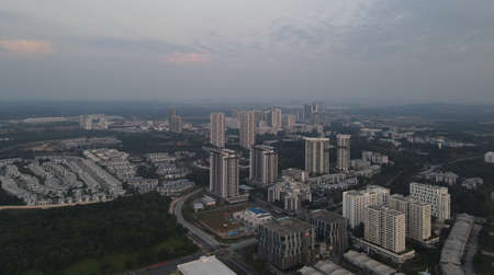 Cyberjaya, Malaysia: Feb 16, 2021 - Overhead view of office buildings area in morning light.