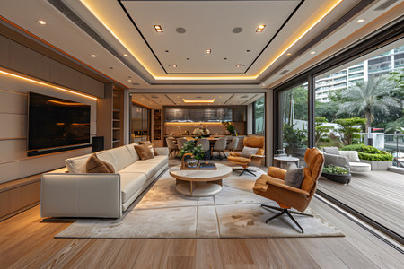 Luxurious living room featuring contemporary furnishings, sleek lighting, and a spacious design. the open patio seamlessly blends indoor and outdoor spaces, offering a perfect blend of comfort and style for high-end residential living, Generative AI