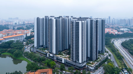 A stunning aerial view of a modern urban apartment complex nestled in a lush green area, showcasing contemporary architecture amidst a vibrant city backdrop.
