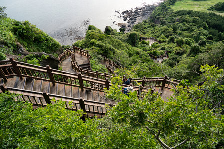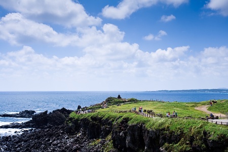 JEJU ISLAND, SOUTH KOREA - AUGUST 19, 2015: Pathiway to famous Seongsan mountain at the shore of volcanic origin Jeju Island - South Korea