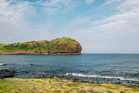 Jeju island, South Korea - Jun. 04, 2023: Beautiful seongsan port at Jeju do (Jeju island), view from top of Seongsan Ilchulbong, sunrise peak.