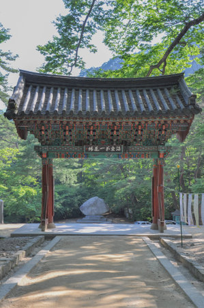 Korean buddhist temple from Silla Dynasty era. Iljumun - first gate at the entrance to Haeinsa Temple, Mount Gaya, Gayasan National Park, South Korea. Translation: The First Gate in the East of the Sea