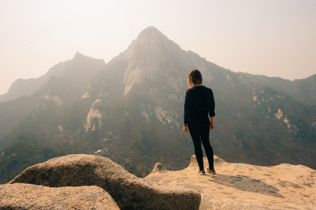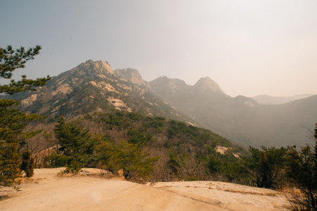 Bukhansan National Park, Seoul, Gyeonggi-do, South Korea, spring landscape view during hike to Baegundae summit peak, process of trekking and climbing to Bukhan mountain, travel and hiking in Korea