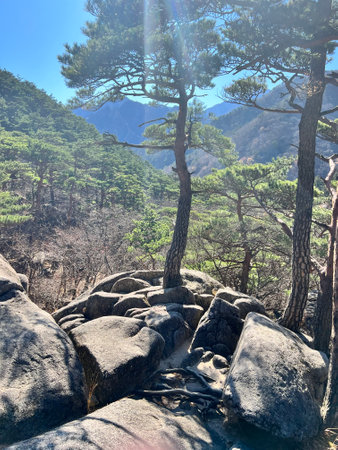 Diamond mountains. DPRK. Mt.Kumgang trekking route. Red korean pine on the rocks