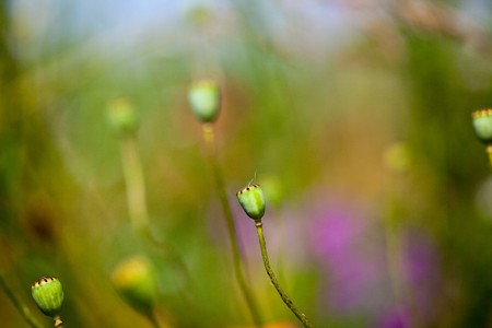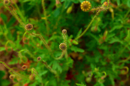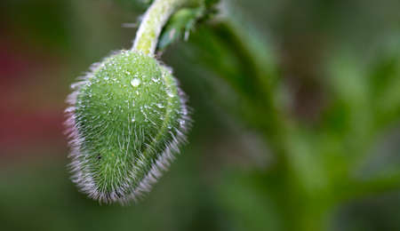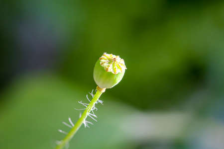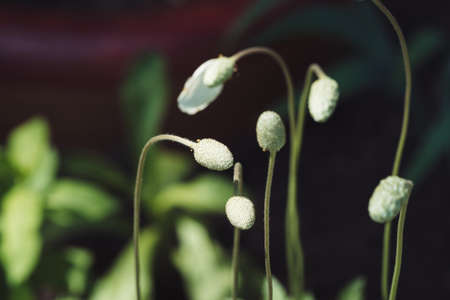 Fluffy poppy stem and bud close up. Abstract floral background. Hanging flower beautiful wallpaper