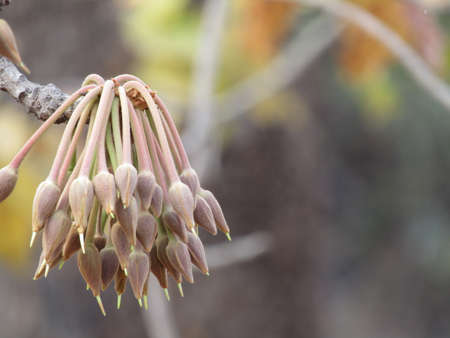Flower in bud, isolated against a natural green and red background, selective focus.