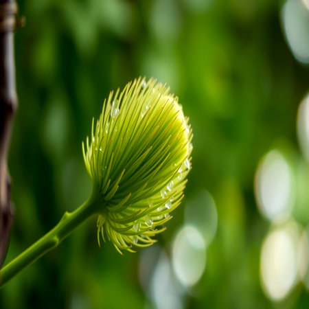 A close-up shot of fresh green plant buds with water droplets glistening in the sunlight, creating a vibrant and refreshing scene.