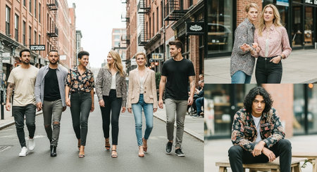 A group of stylish young adults walking down a city street, showcasing modern fashion trends. The scene captures a blend of casual and chic outfits, with a vibrant urban backdrop.