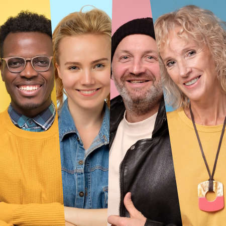 Collage made of portraits different people of diverse gender and age smiling, showing positivity against multicolored background