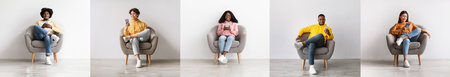 Horizontal portrait of people sit in queue have pleasant conversation with each other share ideas and life experience isolated over grey concrete wall Diverse group in ro : Generative AI