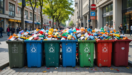 Overflowing street trash bins in city center, colorful litter containers overflowing with garbage, urban waste management issues.